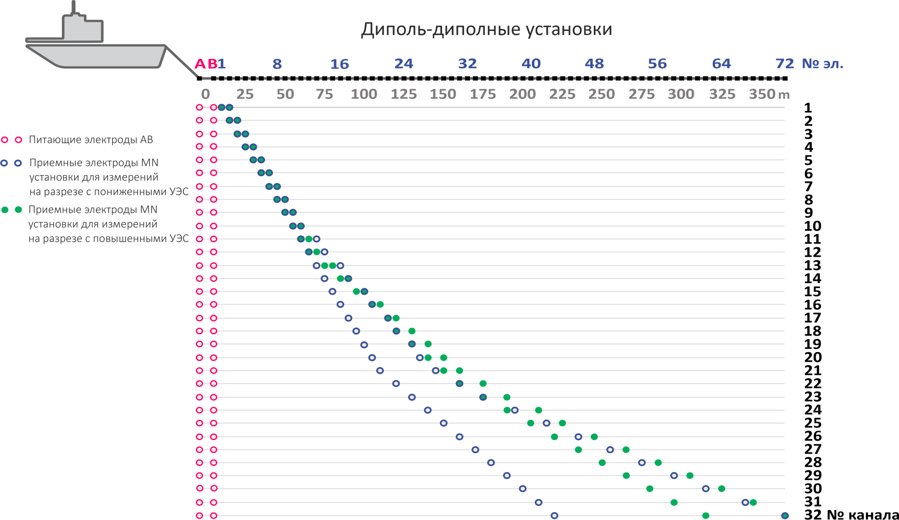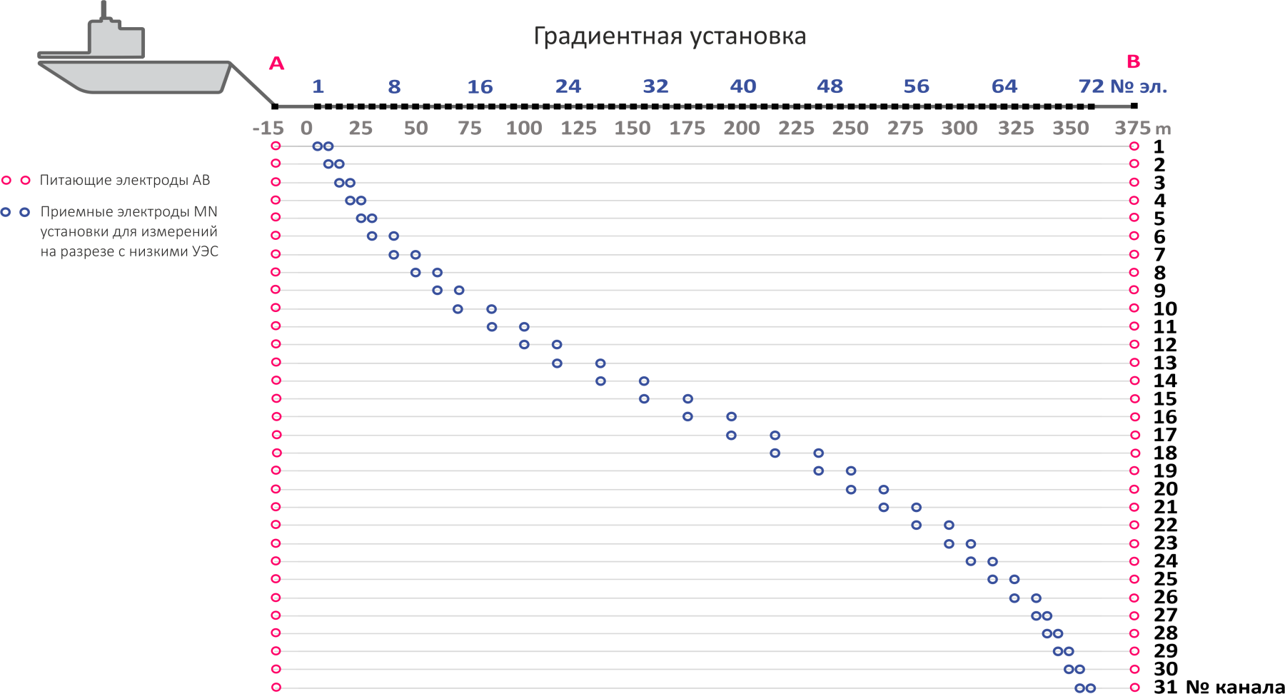 ALMAZ Marine екі диполь-дипольді және бір градиентті орнатуды қолдайды. Дипольді-дипольді қондырғылар жоғары және орташа кедергісі бар тұщы су аймақтарында жақсырақ ажыратымдылық пен тереңдік алуға мүмкіндік береді. Градиентті орнату MN дипольдерінде айтарлықтай жоғары сигнал деңгейін қамтамасыз етеді, сондықтан теңіз суларында (0,2 Ом∙м кедергісі) оны пайдалану қолайлы болуы мүмкін. Орнатулар псевдосекцияны өлшеу нүктелерімен оңтайлы қамтуды қамтамасыз етуге арналған.
