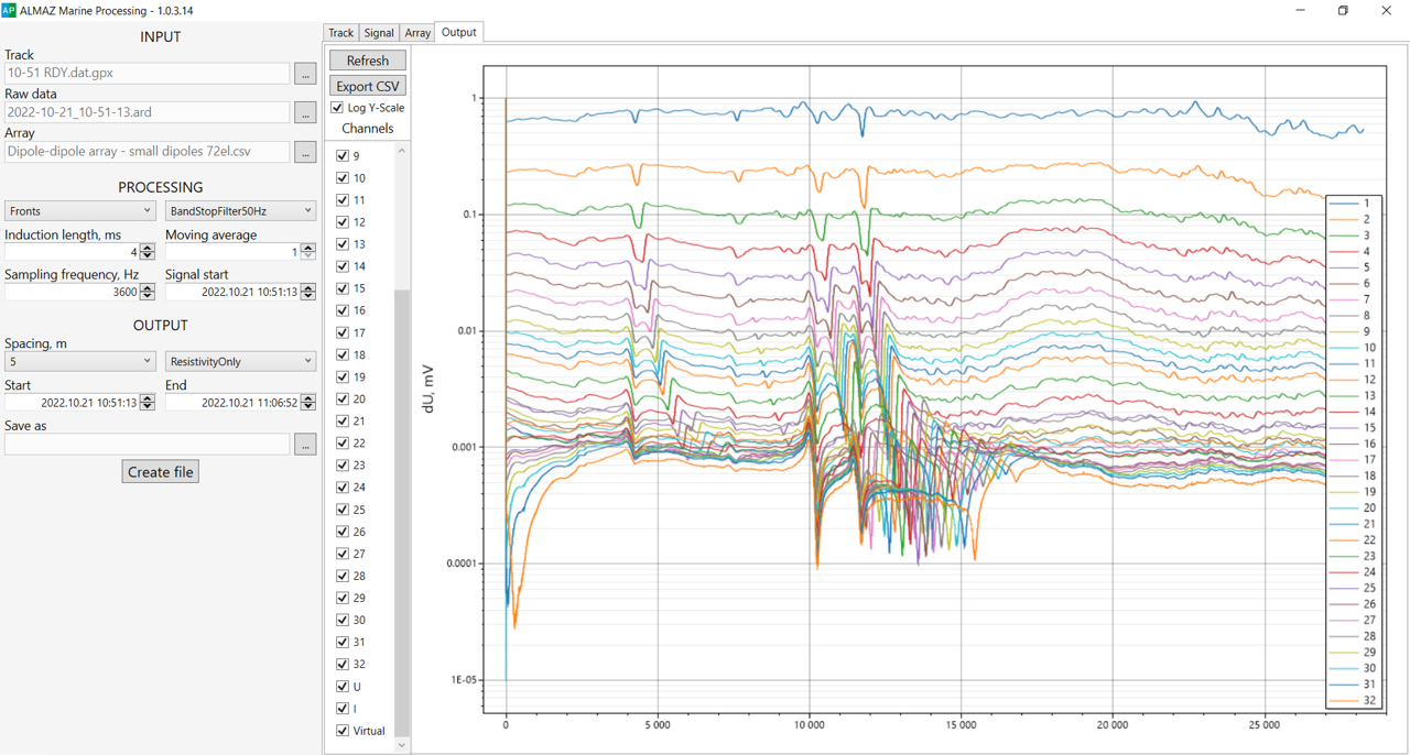 Напряжение, ток, кажущееся сопротивление, процентный частотный эффект, заряжаемость, собственные потенциалы, координаты электродов |
