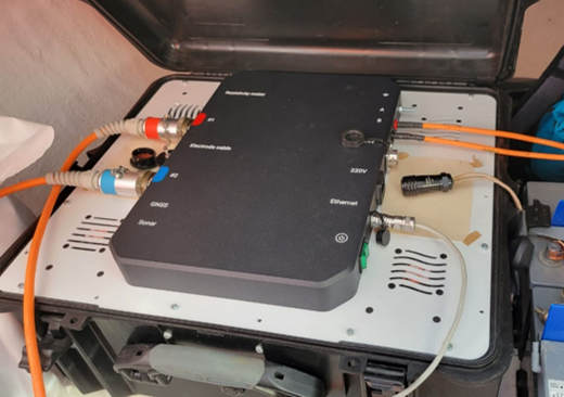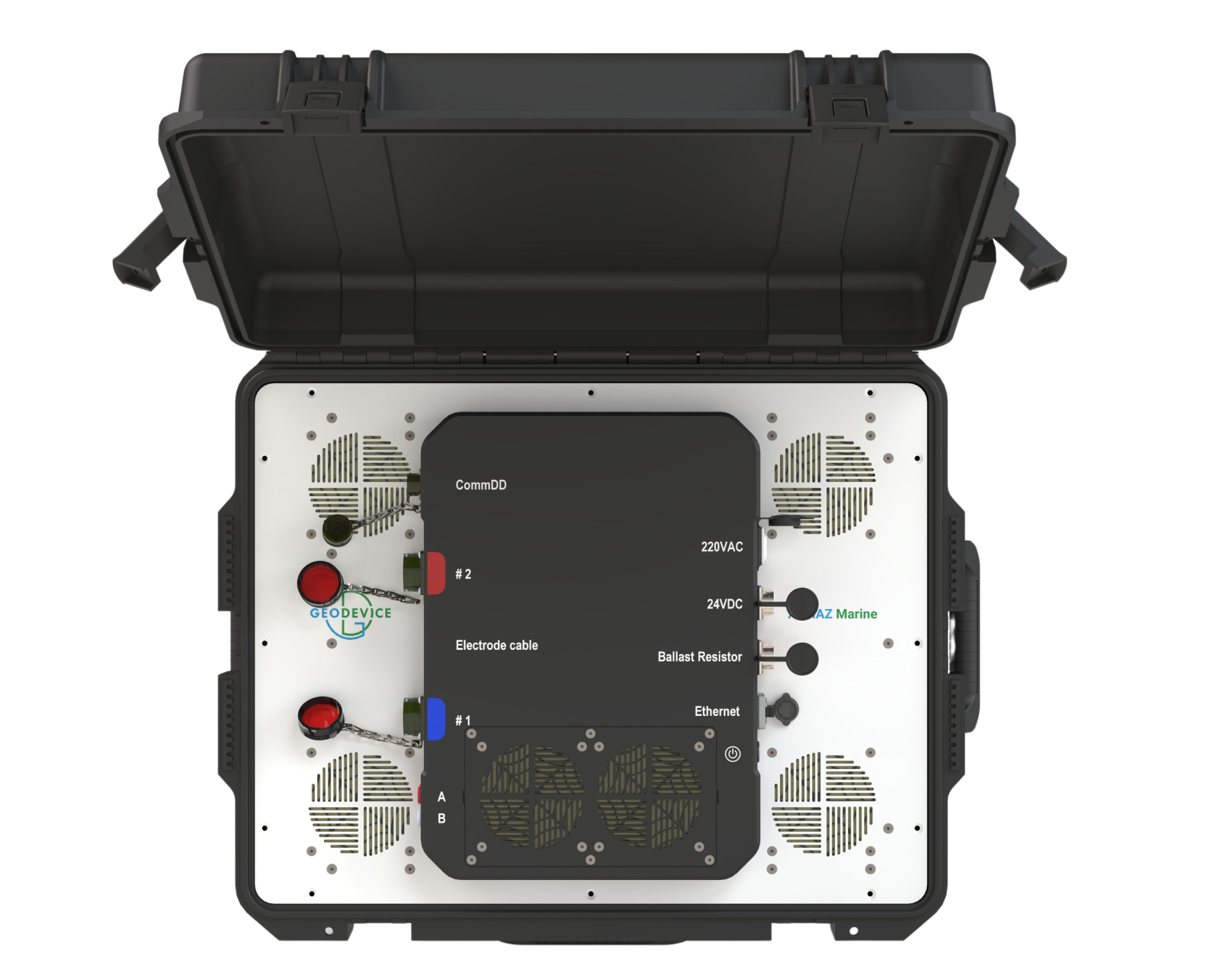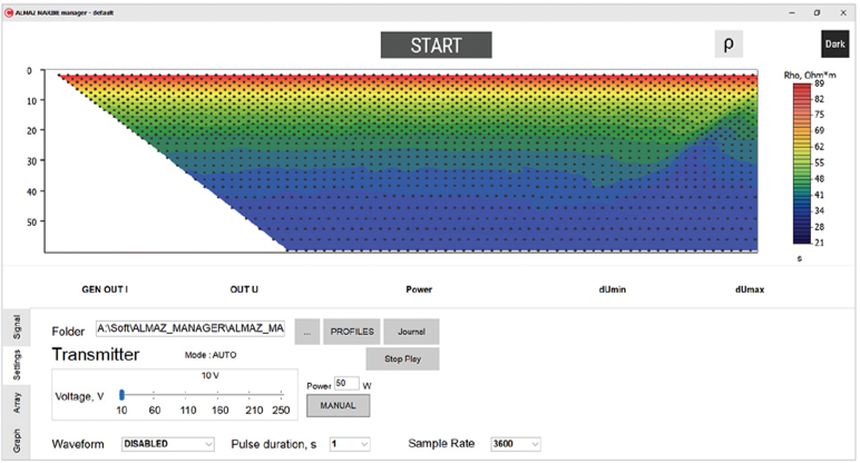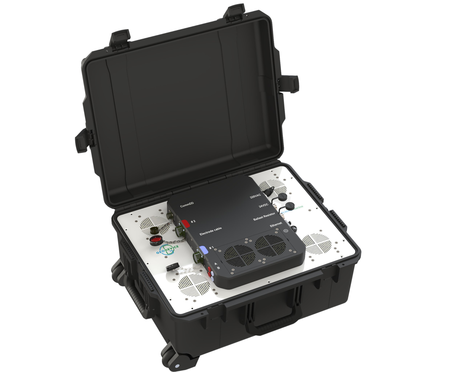 Біз су айдындарында жұмыс істеу үшін арнайы қуаты 3000 Вт-қа дейінгі мамандандырылған генераторды жасадық. Ол 10 А-ға дейінгі токтарды және 300 В-қа дейінгі кернеуді (600 В-қа дейін) шаршы толқынмен немесе үзіліспен шаршы толқынмен жеткізуге қабілетті. Бұл параметрлер 5 метрлік қадаммен стандартты стримерлері бар барлық арналарда, тіпті теңіз суларында да өлшенетін сигнал деңгейін қамтамасыз етеді. Генератор батареялардан (24 В) немесе айнымалы ток желісінен (220 В, 50/60 Гц) қоректенеді. ALMAZ Marine сонымен қатар AB желісіндегі токтың үздіксіз жазылуы бар сыртқы генератормен немесе ток қосқыштарымен жұмыс істеуге мүмкіндік береді.