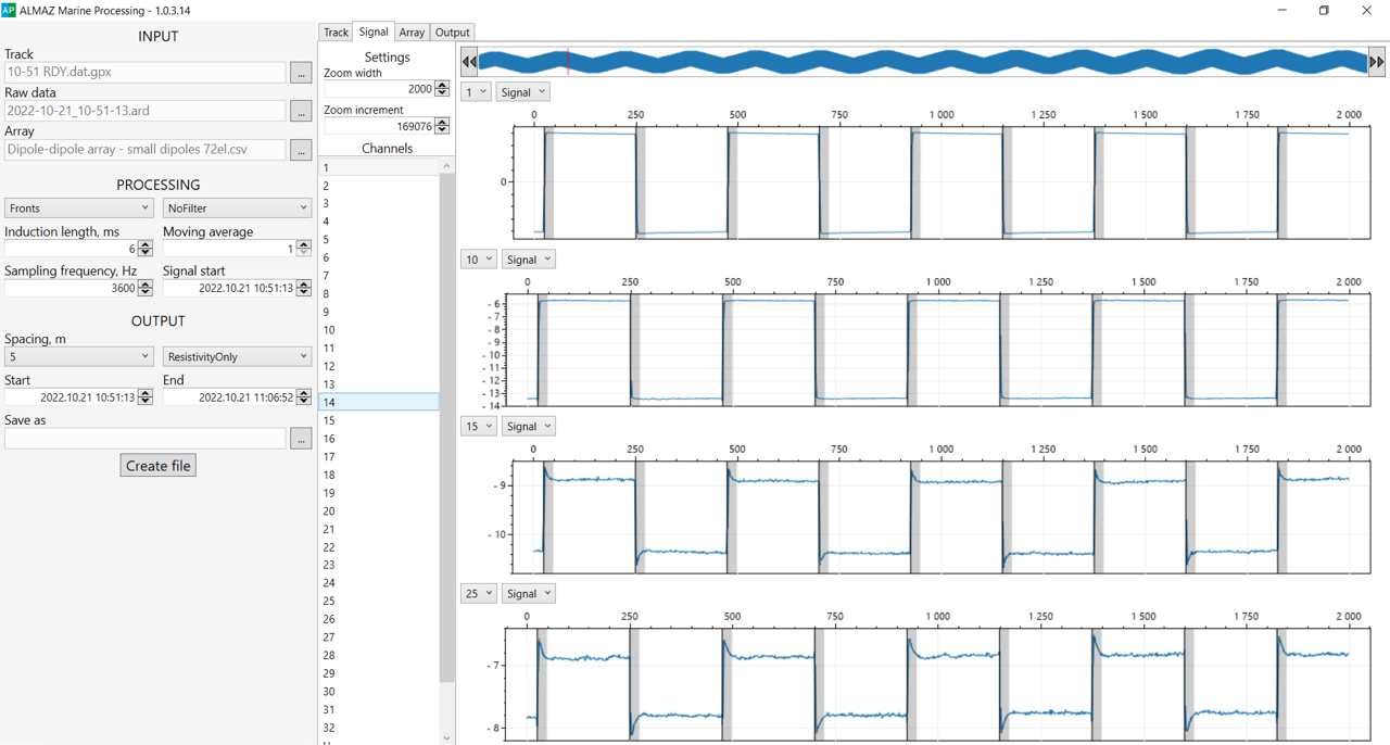 ALMAZ Marine 72 электродты стримерлермен жабдықталған. Стример бойындағы электродтар арасындағы стандартты қадам 2,5, 4 немесе 5 метрді құрайды. Қоректендіретін электродтар қабылдағыш түтіктің сыртында орналасқан және оларды алу оңай реттеледі. Осылайша, қондырғының ұзындығы 162,5-тен 365 немесе одан да көп метрге дейін қамтамасыз етіледі, бұл орташа геологиялық жағдайларда зерттеу тереңдігін сәйкесінше 35-тен 95 м-ге дейін бағалауға мүмкіндік береді. Жер бетіне жақын сүйреуге арналған стример қалтқыларда сүйретіледі, бұл сүңгуір тереңдігін бақылауға ғана емес, сонымен қатар оны акваторияда көрінуге мүмкіндік береді. Қалтқыларды ажыратқанда, стримерді астыңғы жағына қоюға, үшінші тараптың электр томографиялық станцияларына немесе қосқышқа қосуға болады және төменгі бақылауларды орындауға болады. Сондай-ақ, кірістірілген қысым сенсорлары, магниттік компастар және INS бар жерленген стримерлер бар, бұл су бағанындағы қондырғының орнын дәл есептеуге мүмкіндік береді. Төменгі сүйреу жұмыстың жоғары жылдамдығын сақтай отырып, зерттеудің рұқсаты мен тереңдігін арттыруға мүмкіндік береді.
