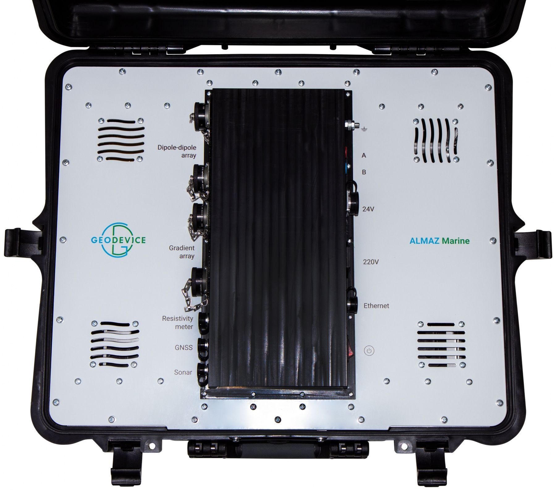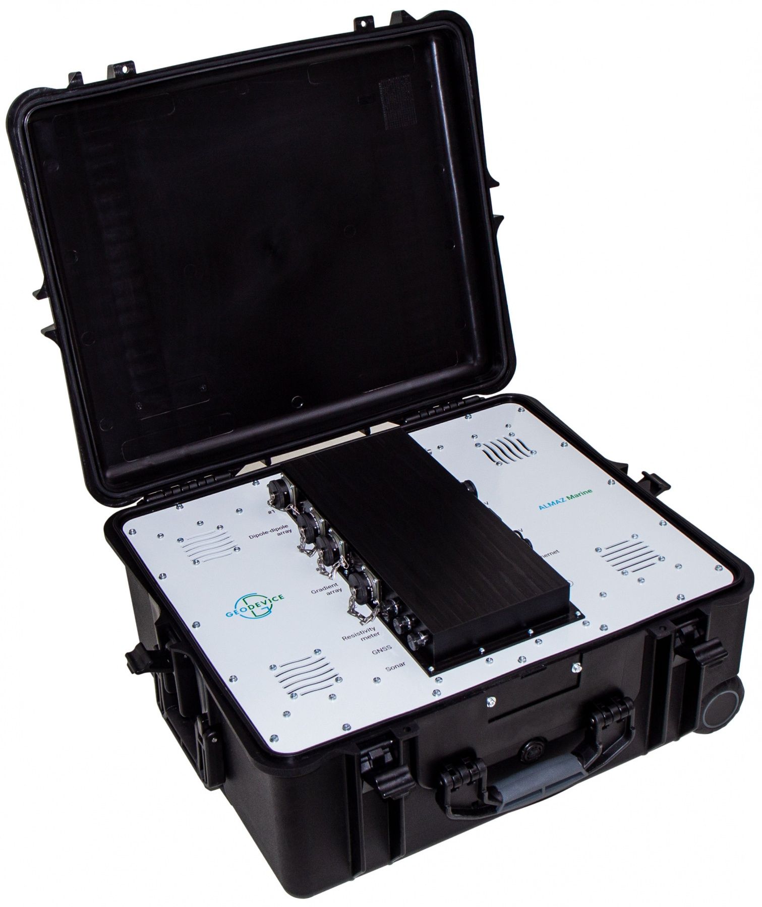 ALMAZ Marine - тұрақты токты (ЭТ/ВП) немесе өтпелі процесті (ЗСБ/МПП/ЭМЗ-ВП) тіркейтін 72 электродты кабельмен тіркеу арқылы үздіксіз су зондтауын (НАЗ) орындауға арналған әлемдегі ең заманауи кешен. Бірегей 3 кВт генератор токты 10 А-ға дейін жеткізуге мүмкіндік береді, ал сыртқы тұрақты ток көзін пайдаланған кезде 50 А қуаты бар ток коммутациясы қол жетімді.. Кірістірілген қосқыш үш қол жетімді параметрдің біреуін таңдауға арналған. Бұл тәсіл 32 өлшеу арнасы (MN) бойымен деректерді синхронды жазумен бірге, тұщы суларда да, түбі бірнеше ондағанға дейінгі тереңдіктегі теңіз суларында да ~75-95 м-ге дейінгі электр томографиясы арқылы мүмкін болатын ең жоғары рұқсатты және зерттеу тереңдігін қамтамасыз етеді. метр.